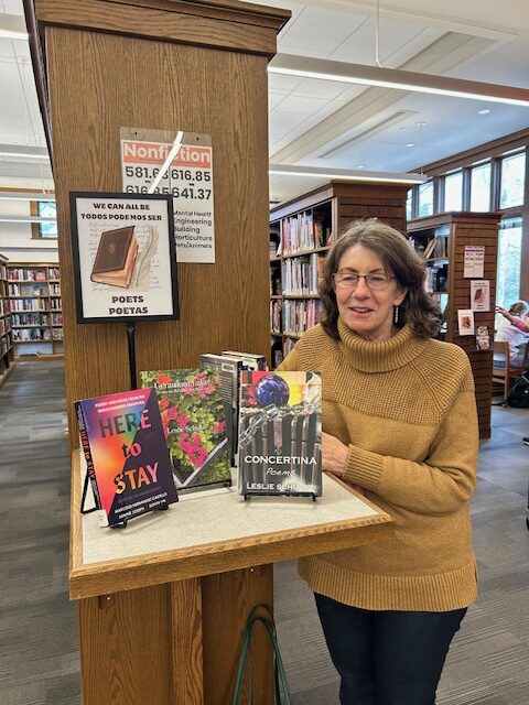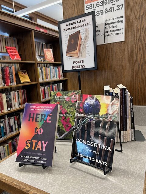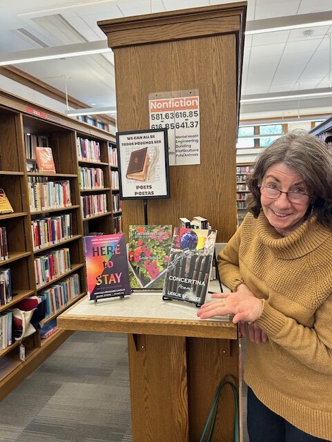 This encounter, a blink of fame, if you will, made me think about the courage it takes to speak up in any way, in any situation. For some–for far too many of our neighbors–it can be downright dangerous. That is why I was especially honored to have two of my own books displayed next to a justly celebrated anthology, Here to Stay: Poetry and Prose from the Undocumented Diaspora. These works ask where does our safety lie, in sharing or in silence? My own poem arose out of this question, emersion in Ogden Nash, and musing on those who attack with words from the shadows. We never know what is really here to stay–but we know for certain that libraries play an essential part in that preservation.