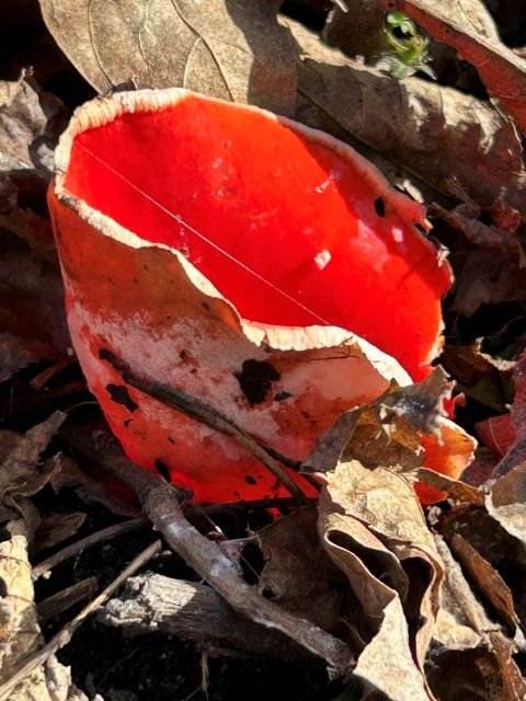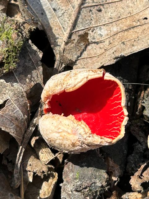 A particular thrill was to see, for the first time, the short-blooming Scarlet Cups fungus. Judy had been telling me about them for several years, but they had never been in season when I was visiting. This year, the timing was perfect.